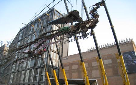3月27号下午,今日美术馆外的小广场,两只怪鸟由6台吊车悬挂,慢慢从地面升起至15米高空,大小分别为28和27米长,8米宽,重12吨。这正是今日美术馆呈现给大家的一场特殊的艺术活动,中国著名当代艺术家徐冰的《凤凰》作品吊装展示的开幕现场。